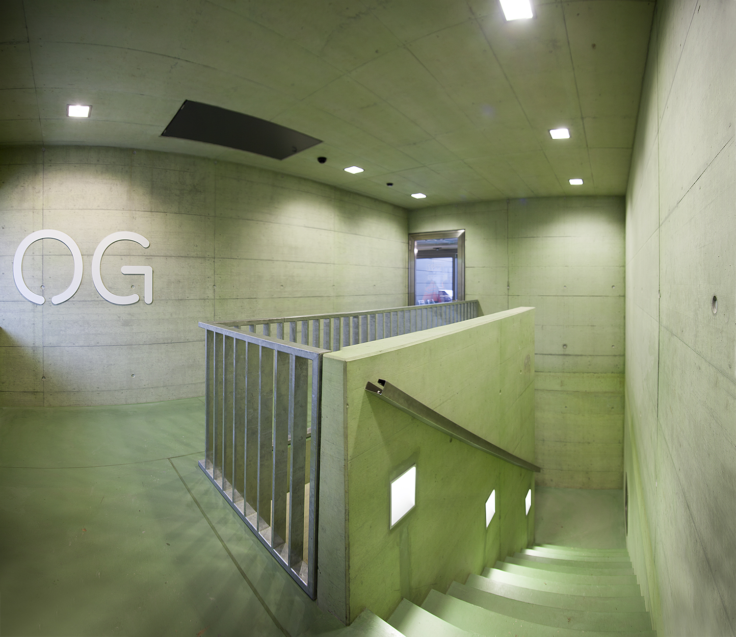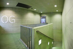 Der Sichtbeton präsentiert sich in einer markanten, typischen Schaltafelstruktur. Ein Farbkonzept macht den Bau zum Erlebnisraum. Die Bauelemente sind in einem intensiven Orangeton gehalten. Dazu im Kontrast haben die Spezialisten der PSS Interservice AG die Sichtbetonflächen in einem dezenten, grünen Farbton angelegt. Über 2.300 Quadratmeter Sichtbeton sind mit der Betonlasur faceal Colour im Farbton faceal Colour Springgras koloriert worden. Damit haben diese nicht nur eine Pigmentierung erhalten, die die charakteristische Optik und Haptik des Sichtbetons erhält, sondern auch eine Oberflächenbehandlung, die über einen oleo- und hydrophoben Oberflächenschutz verfügt. Durch die Farbgebung gewinnt der Beton in seiner originären Ausdruckskraft und trägt zur anmutenden Raumatmosphäre bei. Im oberirdischen Gebäudeteil ist der Sichtbeton mit der transparenten Hochleistungsimprägnierung faceal Oleo HD behandelt. Dadurch ist der Sichtbeton öl- und fettabweisend geschützt und in seinem Aussehen unverändert. Erwähnenswert ist noch, dass über 3.000 Quadratmeter des Sichtbetons während des Rohbaus mit dem PSS 20 Bauphasenschutz vor Verschmutzungen geschützt wurde. Dieser ist reversibel und wird vor der Endbehandlung wieder entfernt.