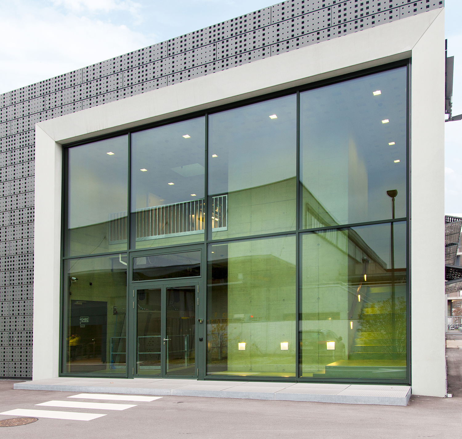 Der Bau sollte nebst der Funktionalität auch eine architektonische Lösung bieten. Energie und Nutzen sollten für die Kunden sichtbar gemacht werden. Deshalb wurden zwei konzeptionelle Öffnungen im Baukörper vorgesehen: Ein Guckkasten, durch den die künstlerische Installation „Der Gefangene Floh“ vom Künstler Yves Netzhammer zu betrachten ist. An anderer Stelle wird durch eine großformatige Fensterfront in Gebäudehöhe des Baukörpers die Tragkonstruktion aus Beton sichtbar. Der Betrachter erhält Einblicke, und es wird offensichtlich, dass hier kein Betonklotz auf die grüne Wiese gestellt, sondern ein unterirdischer Betonbau realisiert wurde. Die eigentliche Betonfassade ist im Eingangsbereich erstmals sichtbar, aber der Großteil ist nun viele Meter unter der Erde.
